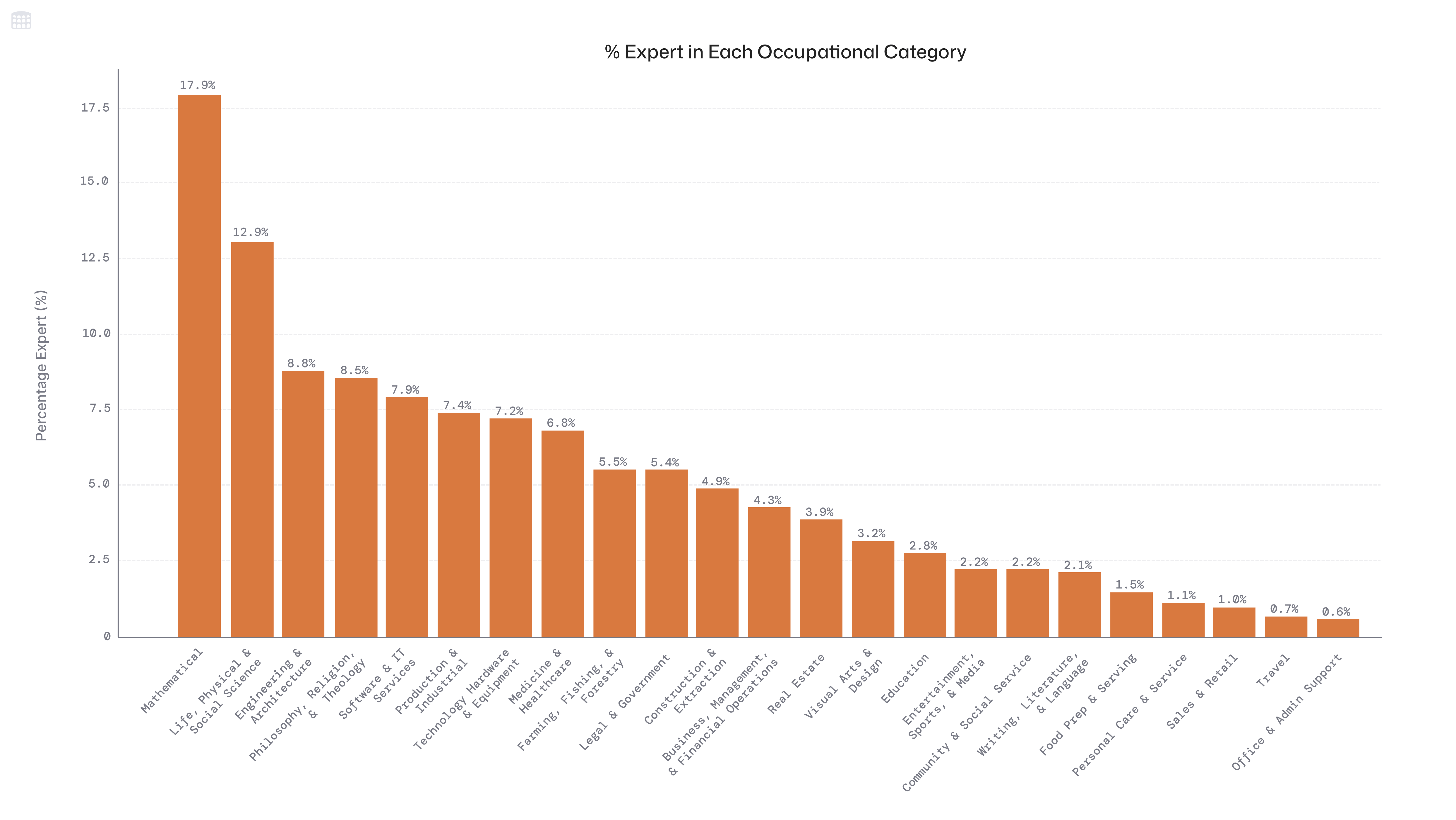Within the expert subset, the distribution of occupational categories shifts: Mathematical and Engineering and Architecture become more prominent; see Figure 3 for a breakdown analogous to Figure 2.