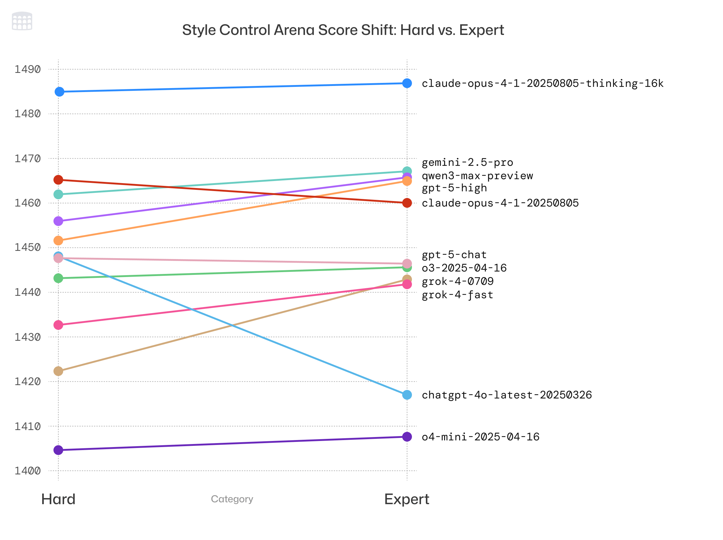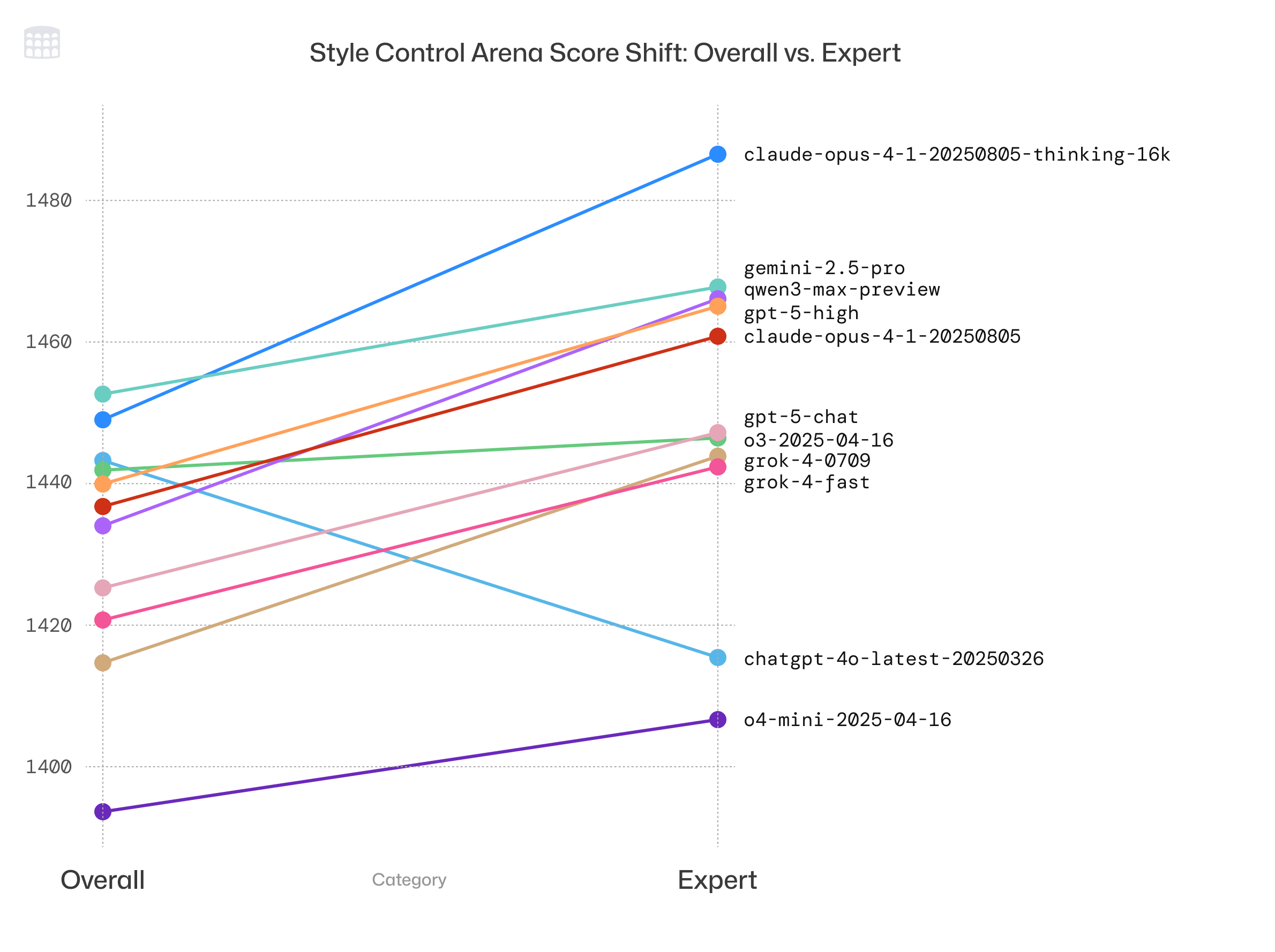 The new Expert leaderboard is substantially different from the default Overall LMArena leaderboard. Some models, like Claude Opus 4.1, GPT-5 high, or Qwen 3 max, experience large score improvements on the Expert leaderboard, while others like GPT 4o experience large score decreases; see Figure 5 for a selection.