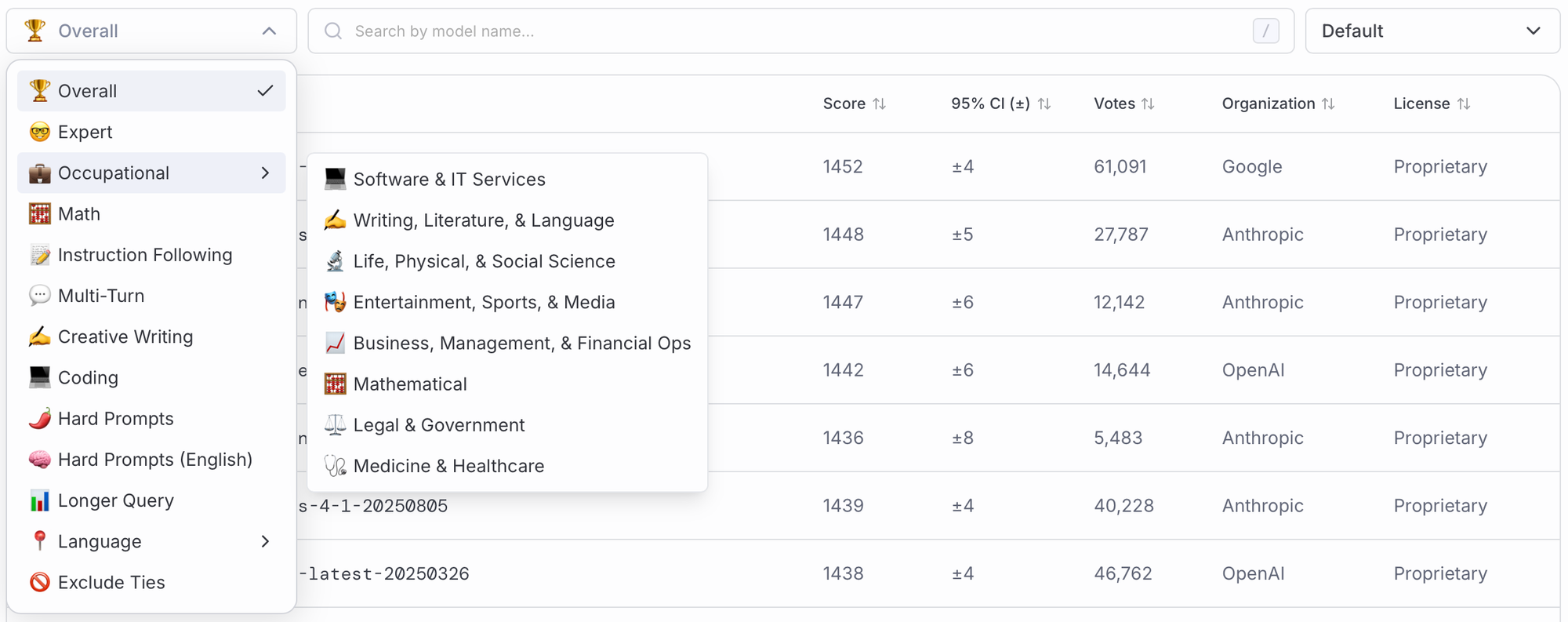 Arena Expert builds on the LMArena evaluation framework to capture that depth, introducing a new system for identifying the most difficult prompts—prompts that are estimated to be asked by people at the forefront of their field of expertise. This category gives rise to a new Expert leaderboard category on LMArena. In addition to Arena Expert, we introduce new Occupational Categories, which map all LMArena prompts to 23 fields of practice. For eight of the largest categories we have added new Occupational leaderboard categories: